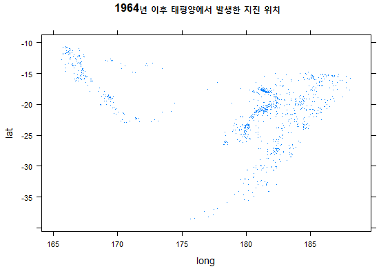 | tplot <- xyplot(lat~long,data=quakes, pch=".") # 산점도 그래프를 tplot에 저장 tplot <- update(tplot, main = "1964년 이후 태평양에서 발생한 지진 위치") # 제목 문자열 추가하기 print(tplot) ![]() |