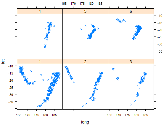 | convert <- transform(quakes,depth2=factor(depth2)) xyplot(lat~long|depth2,data=convert) ![]() |