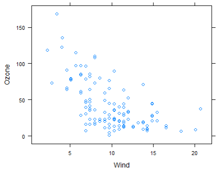 xyplot(Ozone~Wind, data=airquality)![]() |