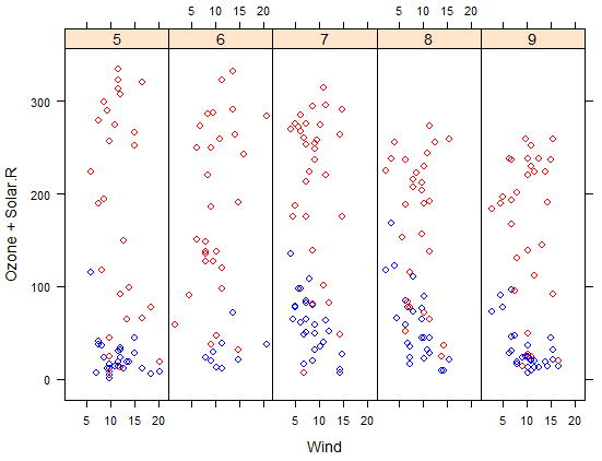 | xyplot(Ozone + Solar.R ~ Wind|factor(Month), data=airquality, col=c("blue","red"), layout=c(5,1)) ![]() |