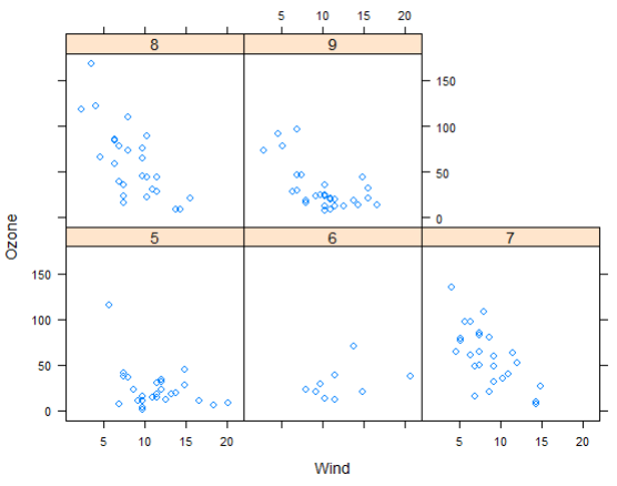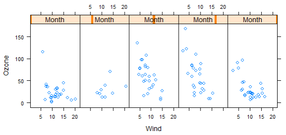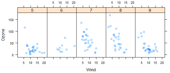 xyplot(Ozone~Wind|Month,data=airquality,layout=c(5,1))![]() |