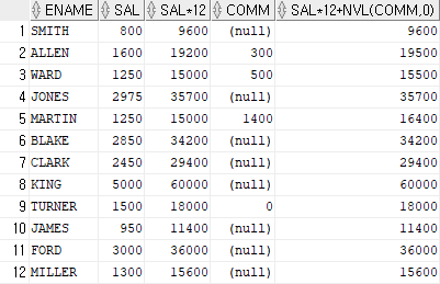 | SELECT ENAME, SAL, SAL*12, COMM, SAL*12 + NVL(COMM, 0) FROM EMP; |