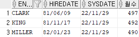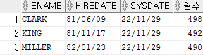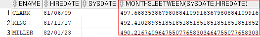 | SELECT ENAME, HIREDATE, SYSDATE, TRUNC(MONTHS_BETWEEN(SYSDATE,HIREDATE)) 월수 FROM EMP WHERE DEPTNO = 10; |