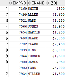 | SELECT EMPNO, ENAME, TO_CHAR(SAL, '$999,999') AS 급여 FROM EMP; |