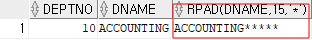 | SELECT DEPTNO, DNAME, RPAD(DNAME, 15, '*') FROM DEPT WHERE DEPTNO = 10; |