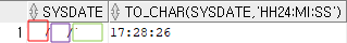 | SELECT SYSDATE, TO_CHAR(SYSDATE, 'HH24:MI:SS') FROM DUAL; |
