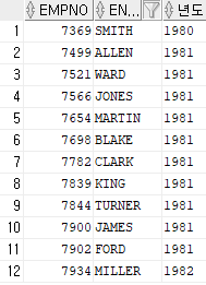 | SELECT EMPNO, ENAME, TO_CHAR(HIREDATE, 'YYYY') AS 년도 FROM EMP; |