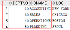 해당 행의 DEPTNO, DNAME 이 같이 불러와졌다.