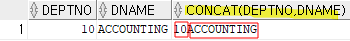 | SELECT DEPTNO, DNAME, CONCAT(DEPTNO, DNAME) FROM DEPT WHERE DEPTNO = 10; |