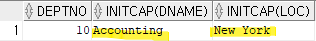 | SELECT DEPTNO, INITCAP(DNAME), INITCAP(LOC) FROM DEPT WHERE DEPTNO = 10; |
