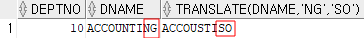| SELECT DEPTNO, DNAME, TRANSLATE(DNAME, 'NG', 'SO') FROM DEPT WHERE DEPTNO = 10; |