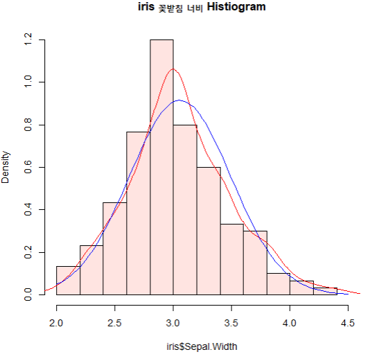 | par(mfrow = c(1,1)) hist(iris$Sepal.Width, xlab = "iris$Sepal.Width", col = "mistyrose", freq = F , main = "iris 꽃받침 너비 Histiogram", xlim = c(2.0,4.5)) ![]() |