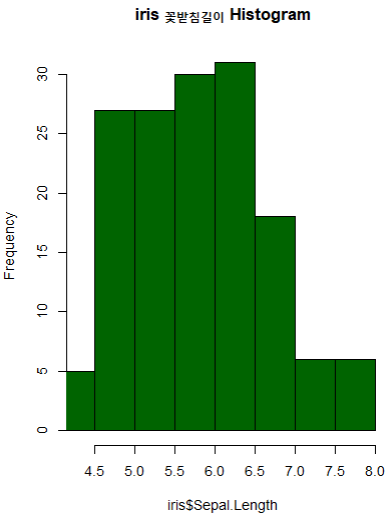 | summary(iris$Sepal.Length) # Min. 1st Qu. Median Mean 3rd Qu. Max. # 4.300 5.100 5.800 5.843 6.400 7.900 hist(iris$Sepal.Length, xlab = "iris$Sepal.Length", col = "darkgreen", main = "iris 꽃받침길이 Histogram", xlim = c(4.3,7.9)) ![]() |