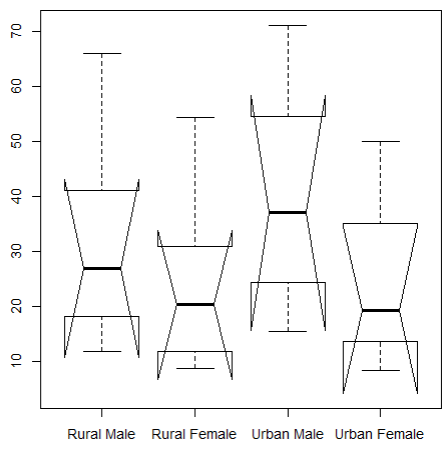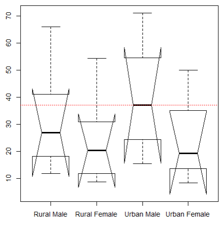 boxplot(VADeaths, range = 0, notch = T)![]() abline(h = 37, lty = 3, col = "red") # h : y 좌표, lty : 점선, col : 색상 ![]() |