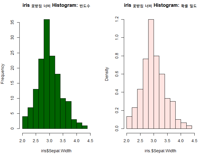 | par(mfrow = c(1, 2)) hist(iris$Sepal.Width, xlab = "iris$Sepal.Width", col = "darkgreen", main = "iris 꽃받침 너비 Histogram: 빈도수", xlim = c(2.0, 4.5)) |