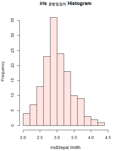| summary(iris$Sepal.Width) # Min. 1st Qu. Median Mean 3rd Qu. Max. # 2.000 2.800 3.000 3.057 3.300 4.400 hist(iris$Sepal.Width, xlab = "iris$Sepal.Width", col = "mistyrose", main = "iris 꽃받침길이 Histogram", xlim = c(2.0,4.5)) ![]() |