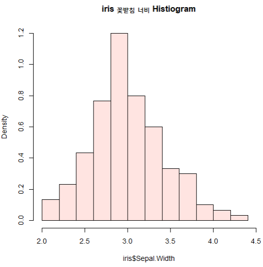 | hist(iris$Sepal.Width, xlab = "iris.$Sepal.Width", col = "mistyrose", freq = F, main = "iris 꽃받침 너비 Histogram: 확률 밀도", xlim = c(2.0, 4.5)) |